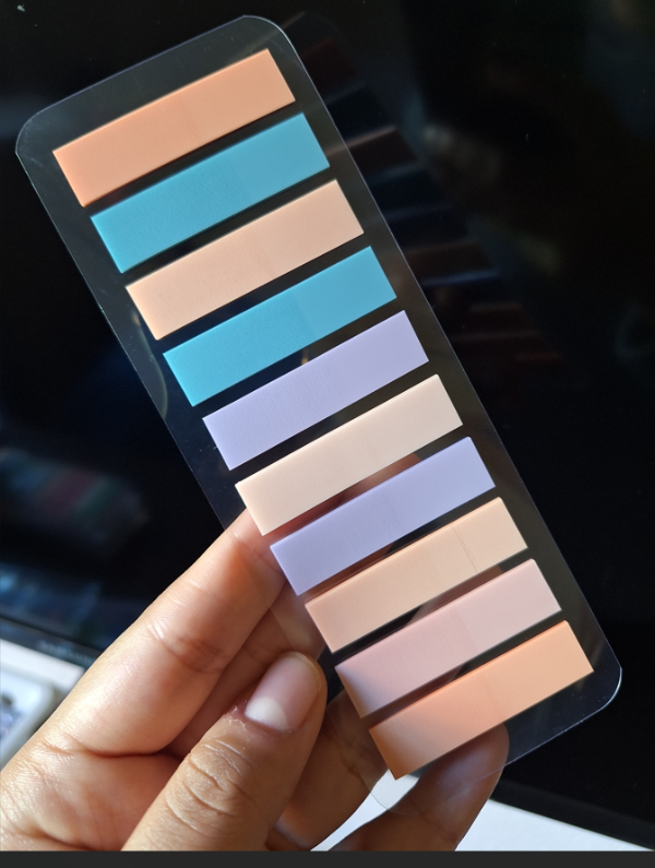 Contiene 200 unidades de hojitas estilo Post it en 10 colores surtidos.