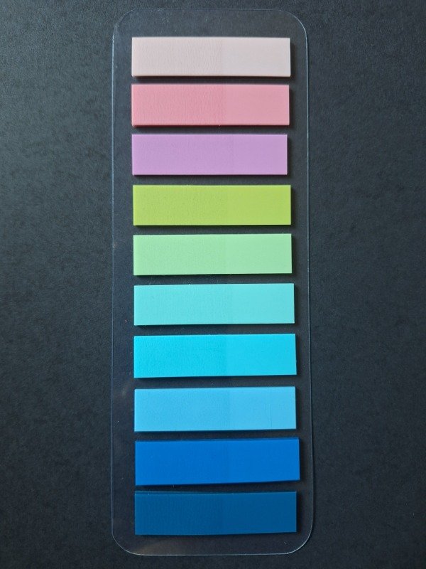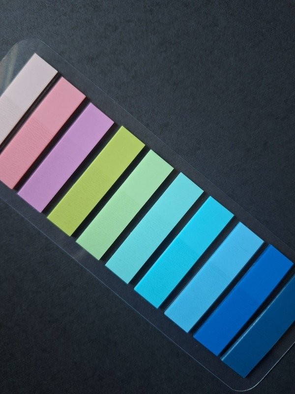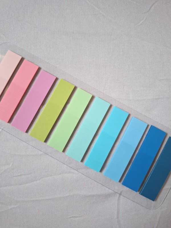 Contiene 200 unidades de hojitas estilo Post it en 10 colores surtidos.