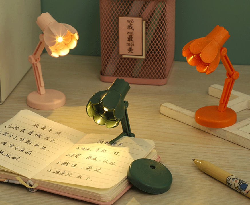 Mini lampara de lectura estilo flor color rosa pastel, a pilas con base redonda imantada removible y broche para sujetar al libro. Vas a poder disfrutar de leer tu lectura aún en la oscuridad!