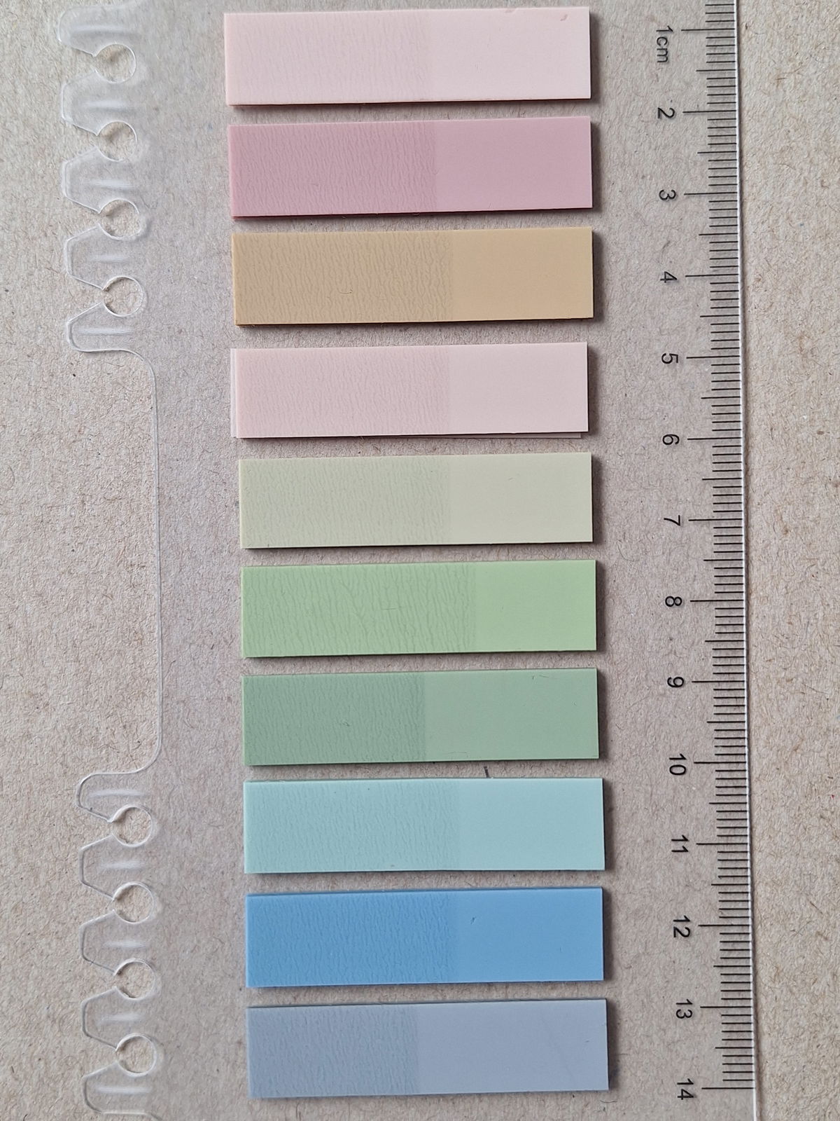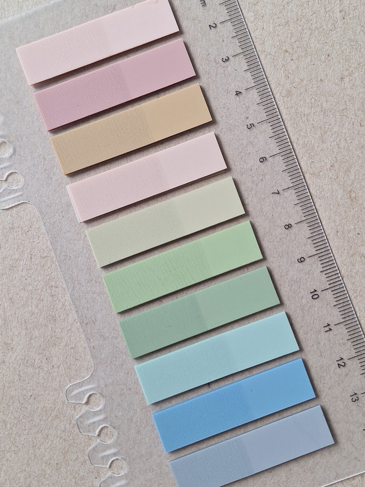 Contiene 200 unidades de hojitas estilo Post it en 10 colores surtidos con regla.